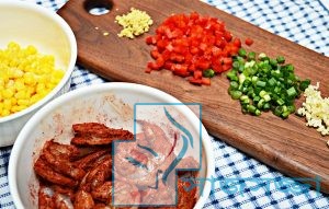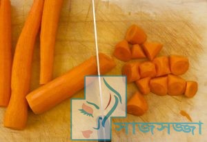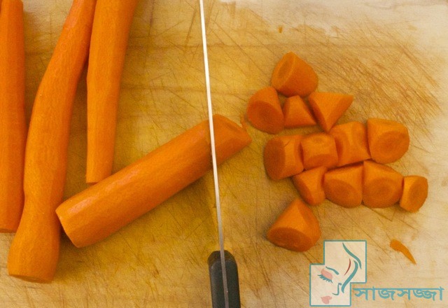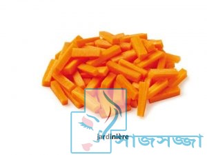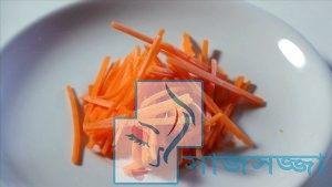 গাজর বা অন্য সবজি খোসা ছাড়িয়ে ৫-৬ সেন্টিমিটার করে টুকরা করতে হবে। এবার একটি টুকরার চারপাশ থেকে কেটে একটি চারকোনা অংশ তৈরি করতে হবে। এই চারকোনা অংশটি থেকে কয়েকটি স্লাইস কাটতে হবে। তারপর সেগুলোকে আবার চিকন করে কেটে নিন। টুকরাগুলোর পুরুত্ব হবে ১ সেন্টিমিটার।