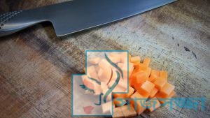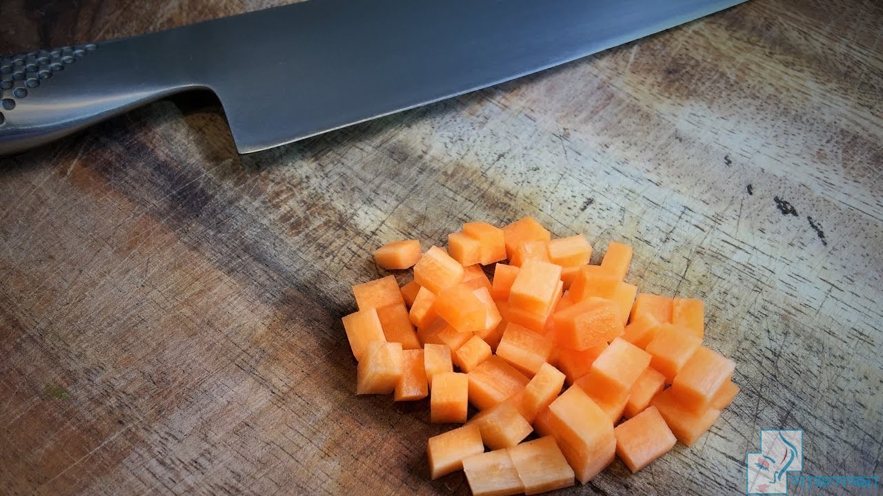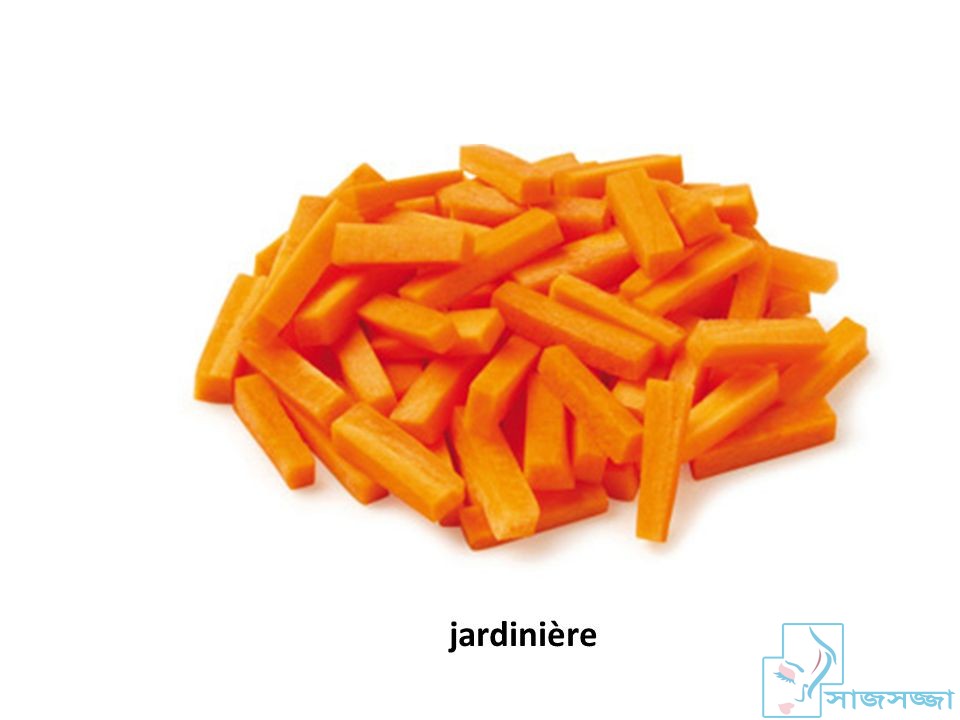 গাজর,পেঁয়াজ বা যে কোন সবজি ১-৩ মিলিমিটার দৈর্ঘ্যে ছোট ছোট করে কাটতে হবে। সাধারণত গাজর, পেঁয়াজ, শালগম ইত্যাদি এভাবে কাটা হয়।